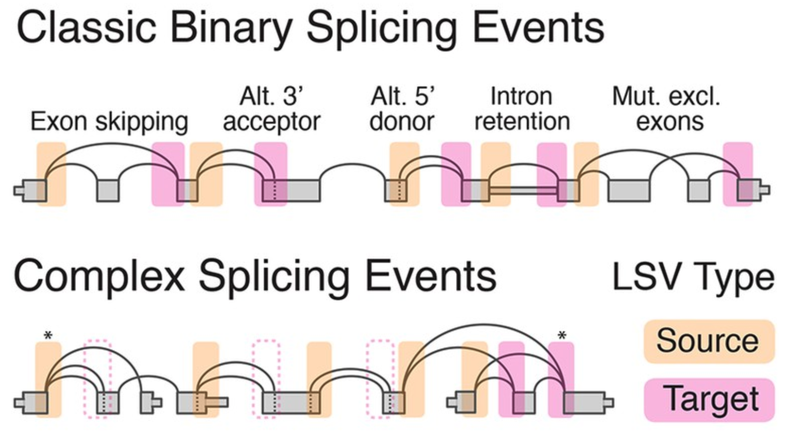 Each local splicing variation (LSV) consists of two or more splice junctions stemming from a given reference exon. A target LSV consists of two or more junctions connecting to a reference exon downstream while a single source LSV involves multiple junctions stemming out of an upstream exon as illustrated below